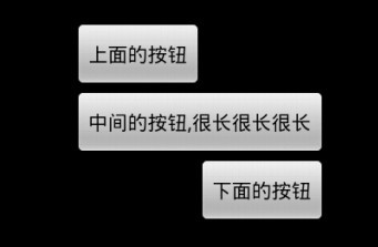 <RelativeLayout xmlns:android="http://schemas.android.com/apk/res/android" android:layout_width="fill_parent" android:layout_height="fill_parent" > <Button android:id="@+id/button1" android:layout_width="wrap_content" android:layout_height="wrap_content" android:text="中间的按钮,很长很长很长" android:layout_centerInParent="true" > </Button> <Button android:id="@+id/button2" android:layout_width="wrap_content" android:layout_height="wrap_content" android:text="上面的按钮" android:layout_above="@id/button1" android:layout_alignLeft="@id/button1" > </Button> <Button android:id="@+id/button3" android:layout_width="wrap_content" android:layout_height="wrap_content" android:text="下面的按钮" android:layout_below="@id/button1" android:layout_alignRight="@id/button1" --android:layout_alignParentRight="true" 这个也常用 > </Button> </RelativeLayout>