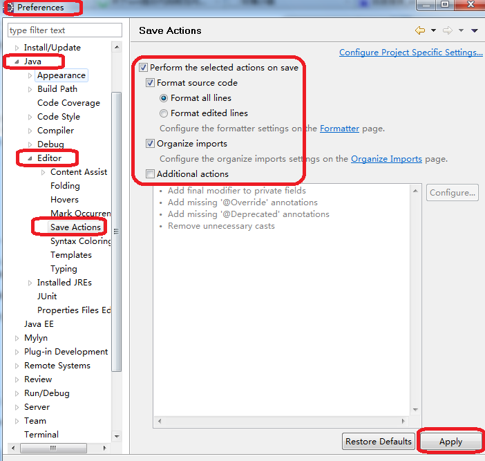 具体方法:windows-->Preferences-->Java --> Editor-->Save Actions, 看到右边的选项了吧,勾选“Perform the selected actions on save”,其他选项根据需要自己选择或者配置就可以了。