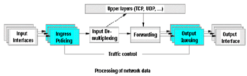 接收包从输入接口(Input Interface)进来后,经过流量限制(Ingress Policing)丢弃不符合规定的数据包,由输入多路分配器(Input De-Multiplexing)进行判断选择:如果接收包的目的是本主机,那么将该包送给上层处理;否则需要进行转发,将接收包交到转发块(Forwarding Block)处理。转发块同时也接收本主机上层(TCP、UDP等)产生的包。转发块通过查看路由表,决定所处理包的下一跳。然后,对包进行排列以便将它们传送到输出接口(Output Interface)。一般我们只能限制网卡发送的数据包,不能限制网卡接收的数据包,所以我们可以通过改变发送次序来控制传输速率。Linux流量控制主要是在输出接口排列时进行处理和实现的。
