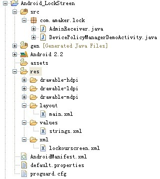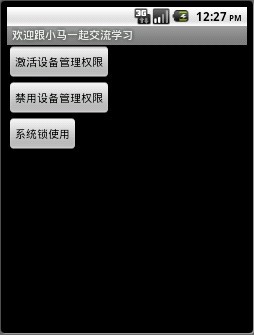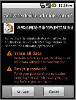 调用系统的锁屏功能锁定屏幕 调用系统的锁屏Demo程序运行后:[img][/img]点击激活设备管理权限按钮显示如下:[img][/img]点击Activate后,然后点击系统锁使用按钮,界面如下:[img][/img]工程结构图:[img][/img]AdminReceiver