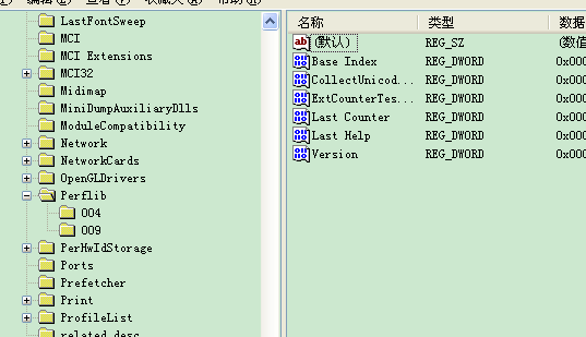 处,在右边的树形目录下可以看到Perflib目录下有004和009两个子目录。