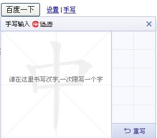 嘿嘿,之前在iciba上领教过这个功能,感觉相当不错,识别率还相当高.今天在百度搜索http://www.baidu.com/s?wd=site%3Awww.9qc.com的时候,突然发现搜索按钮右边一个 手写 链接,点击一看,弹出一个手写输入面板.如图: