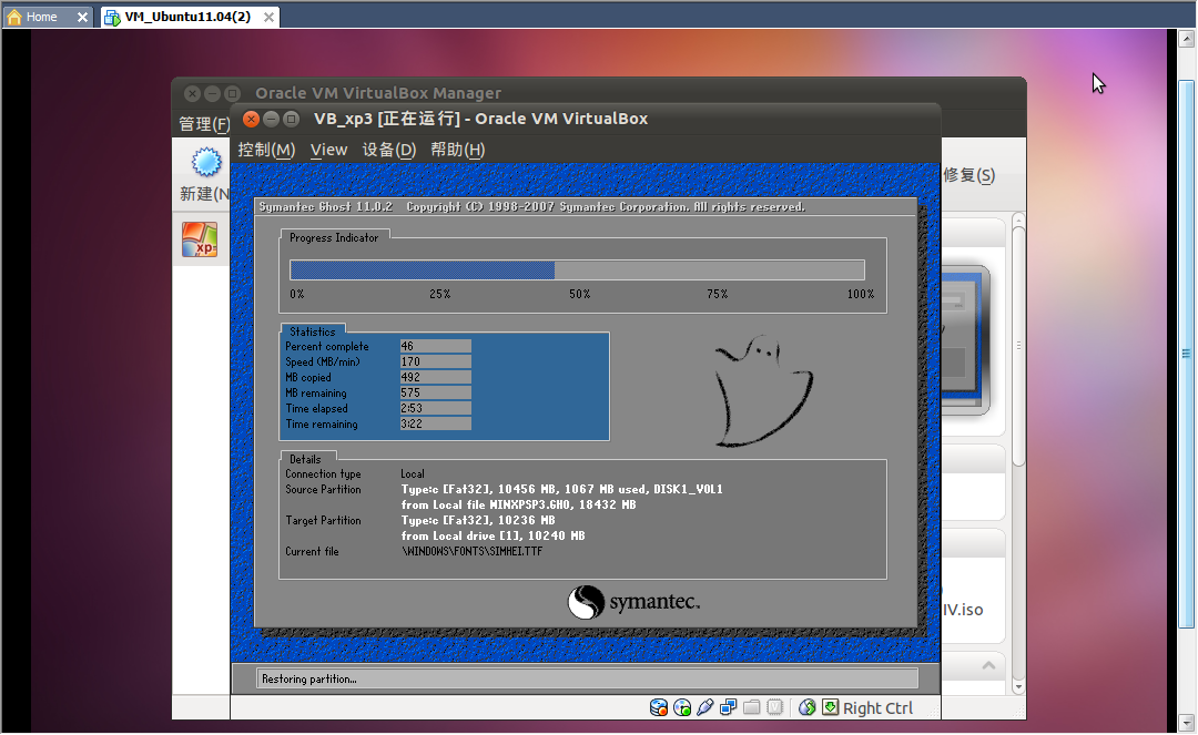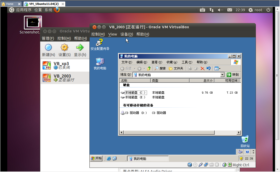 Ubuntu11.04里面成功安装VirtualBox4.1 今天 在win7的机器里面安装 vmware,然后安装 ubuntu11.04,然后在 ubuntu里面安装 virtualbox4.1,成功了。并成功在里面安装xp虚拟机。现在截图如下:主要是 dkms的安装要注意。从win里面拷贝一个 原来的 vbox虚拟机文件系统,也可以打开: