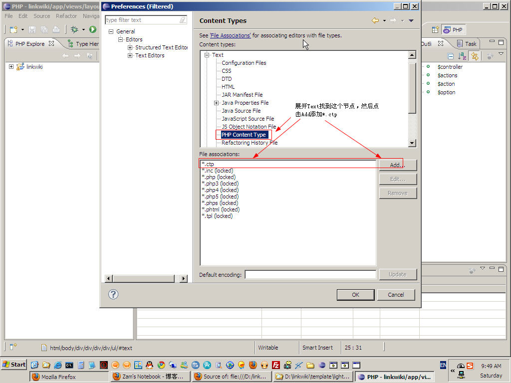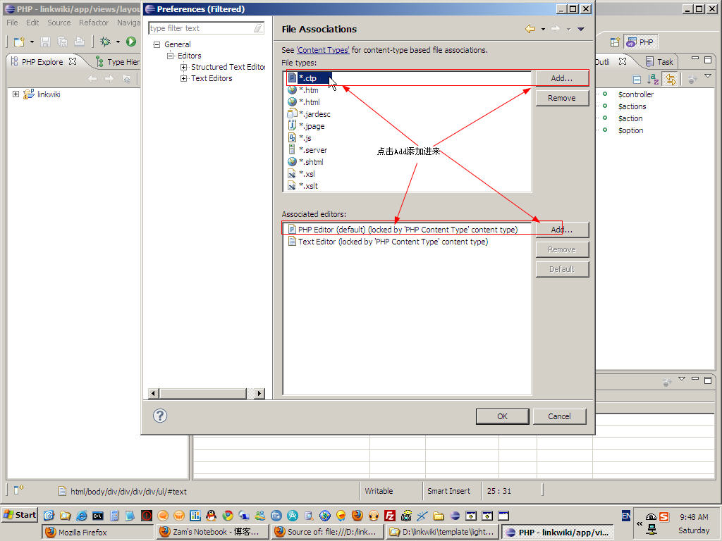 3>点击File Associations,在弹出的窗口的File type列表框旁边点击Add,添加*.ctp.然后保持选中*.ctp的状态不变,在下面的列表框附近点击Add,为*.ctp添加Associated Editor,选中PHP Editor