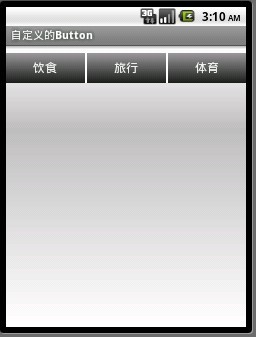 <?xml version="1.0" encoding="utf-8"?><LinearLayoutxmlns:android="http://schemas.android.com/apk/res/android"android:layout_width="fill_parent"android:layout_height="fill_parent"android:background="@drawable/background_color"android:orientation="vertical"><LinearLayoutandroid:layout_width="fill_parent"android:layout_height="10dip" /><LinearLayoutandroid:layout_width="fill_parent"android:layout_height="40dip"><com.amaker.testbutton.TextButtonandroid:layout_width="fill_parent"android:layout_height="fill_parent"android:layout_weight="1"android:text="饮食"android:gravity="center"android:background="@drawable/button_selector"android:focusable="true"android:clickable="true" /><Viewandroid:layout_width="2px"android:layout_height="fill_parent"android:background="#FFFFFFFF" /><com.amaker.testbutton.TextButtonandroid:layout_width="fill_parent"android:layout_height="fill_parent"android:layout_weight="1"android:text="旅行"android:gravity="center"android:background="@drawable/button_selector"android:focusable="true"android:clickable="true" /><Viewandroid:layout_width="2px"android:layout_height="fill_parent"android:background="#FFFFFFFF" /><com.amaker.testbutton.TextButtonandroid:layout_width="fill_parent"android:layout_height="fill_parent"android:layout_weight="1"android:text="体育"android:gravity="center"android:background="@drawable/button_selector"android:focusable="true"android:clickable="true" /></LinearLayout></LinearLayout>