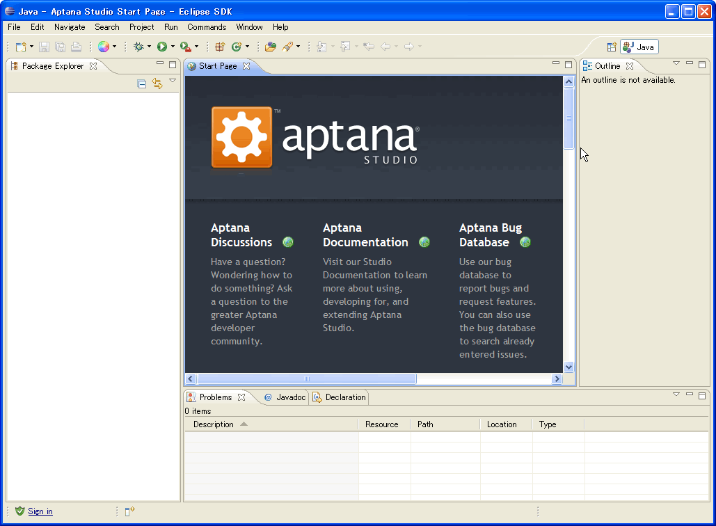 6、安装完成后,需要重新启动Eclipse。当Eclipse重新启动后,就能看到aptana的开始页。同时,在左下角有[Sign in]连接。