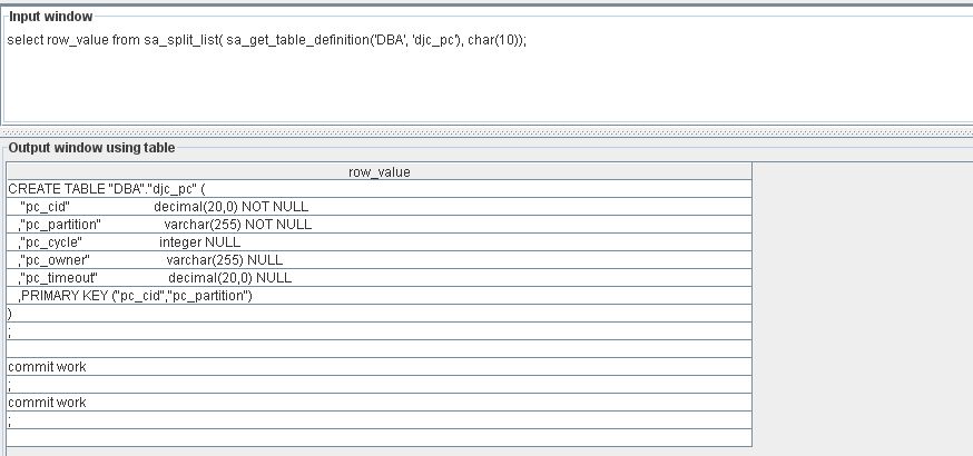 select row_value from sa_split_list( sa_get_table_definition('DBA', 'djc_pc'), char(10));