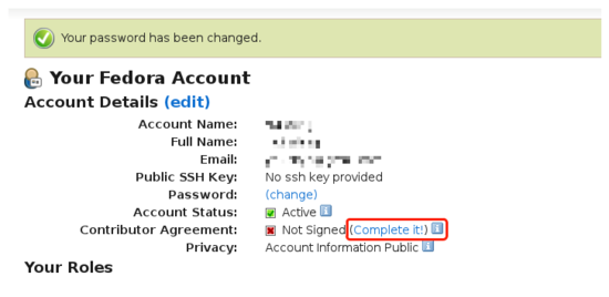 现在需要签署CLA, 点击"Complete it!",补充电话和国家信息,勾选同意就可以了,此时账户信息发生了变化,如图所示,自动加入了两个角色: