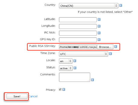 生成证书的工作完成后,我们回到Fedora的用户页面,点击"My Account"进行编辑,上传刚才产生的id_rsa.pub文件,点击保存,如图所示: