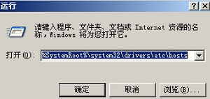 在运行中输入%SystemRoot%\system32\drivers\etc\hosts,然后确定。