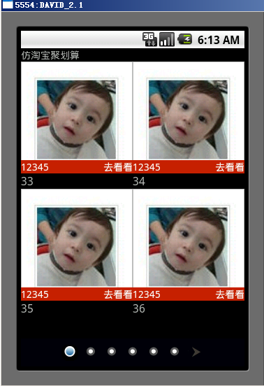 package cn.anycall.ju;import java.util.ArrayList;import java.util.HashMap;import java.util.List;import java.util.Map;import android.app.Activity;import android.content.ActivityNotFoundException;import android.content.Context;import android.content.Intent;import android.content.pm.ResolveInfo;import android.os.Bundle;import android.os.Handler;import android.os.Looper;import android.os.Message;import android.view.KeyEvent;import android.view.View;import android.view.Window;import android.widget.AdapterView;import android.widget.AdapterView.OnItemClickListener;import android.widget.GridView;import android.widget.Toast;import cn.anycall.ju.ScrollLayout.OnScreenChangeListenerDataLoad;/** * GridView分页显示安装的应用程序 */public class AllAppList extends Activity {private ScrollLayout mScrollLayout;private static final float APP_PAGE_SIZE = 4.0f;private Context mContext;private PageControlView pageControl;public MyHandler myHandler;public int n=0;private DataLoading dataLoad;@Overrideprotected void onCreate(Bundle savedInstanceState) {// TODO Auto-generated method stubsuper.onCreate(savedInstanceState);this.requestWindowFeature(Window.FEATURE_NO_TITLE);mContext = this;setContentView(R.layout.main);dataLoad = new DataLoading();mScrollLayout = (ScrollLayout)findViewById(R.id.ScrollLayoutTest);myHandler = new MyHandler(this,1);//起一个线程更新数据MyThread m = new MyThread();new Thread(m).start();} /** * gridView 的onItemLick响应事件 */public OnItemClickListener listener = new OnItemClickListener() {public void onItemClick(AdapterView<?> parent, View view, int position,long id) {// TODO Auto-generated method stubSystem.out.println("position="+position);}};@Overrideprotected void onDestroy() {// TODO Auto-generated method stubandroid.os.Process.killProcess(android.os.Process.myPid());super.onDestroy();}@Overridepublic boolean onKeyDown(int keyCode, KeyEvent event) {// TODO Auto-generated method stubif (keyCode == KeyEvent.KEYCODE_BACK) {finish();return true;}return super.onKeyDown(keyCode, event);}// 更新后台数据class MyThread implements Runnable {public void run() {try {Thread.sleep(1000*3);} catch (InterruptedException e) {// TODO Auto-generated catch blocke.printStackTrace();}String msglist = "1";Message msg = new Message();Bundle b = new Bundle();// 存放数据b.putString("rmsg", msglist);msg.setData(b);AllAppList.this.myHandler.sendMessage(msg); // 向Handler发送消息,更新UI}}class MyHandler extends Handler {private AllAppList mContext;public MyHandler(Context conn,int a) {mContext = (AllAppList)conn;}public MyHandler(Looper L) {super(L);}// 子类必须重写此方法,接受数据@Overridepublic void handleMessage(Message msg) {// TODO Auto-generated method stubsuper.handleMessage(msg);Bundle b = msg.getData();String rmsg = b.getString("rmsg");if ("1".equals(rmsg)) {// do nothing List<Map> list = new ArrayList<Map>(); for(int i =0;i<16;i++){ n++; Map map = new HashMap(); map.put("name", n); list.add(map); } int pageNo = (int)Math.ceil( list.size()/APP_PAGE_SIZE);for (int i = 0; i < pageNo; i++) {GridView appPage = new GridView(mContext);// get the "i" page dataappPage.setAdapter(new AppAdapter(mContext, list, i));appPage.setNumColumns(2);appPage.setOnItemClickListener(listener);mScrollLayout.addView(appPage);}//加载分页pageControl = (PageControlView) findViewById(R.id.pageControl);pageControl.bindScrollViewGroup(mScrollLayout);//加载分页数据dataLoad.bindScrollViewGroup(mScrollLayout);}}}//分页数据class DataLoading {private int count;public void bindScrollViewGroup(ScrollLayout scrollViewGroup) {this.count=scrollViewGroup.getChildCount();scrollViewGroup.setOnScreenChangeListenerDataLoad(new OnScreenChangeListenerDataLoad() {public void onScreenChange(int currentIndex) {// TODO Auto-generated method stubgeneratePageControl(currentIndex);}});}private void generatePageControl(int currentIndex){//如果到最后一页,就加载16条记录if(count==currentIndex+1){MyThread m = new MyThread();new Thread(m).start();}}}}package cn.anycall.ju;import java.util.ArrayList;import java.util.List;import java.util.Map;import android.content.Context;import android.content.pm.PackageManager;import android.content.pm.ResolveInfo;import android.view.LayoutInflater;import android.view.View;import android.view.ViewGroup;import android.widget.BaseAdapter;import android.widget.ImageView;import android.widget.TextView;import cn.anycall.ju.R;public class AppAdapter extends BaseAdapter {private List<Map> mList;private Context mContext;public static final int APP_PAGE_SIZE = 4;private PackageManager pm;public AppAdapter(Context context, List<Map> list, int page) {mContext = context;pm = context.getPackageManager();mList = new ArrayList<Map>();int i = page * APP_PAGE_SIZE;int iEnd = i+APP_PAGE_SIZE;while ((i<list.size()) && (i<iEnd)) {mList.add(list.get(i));i++;}}public int getCount() {// TODO Auto-generated method stubreturn mList.size();}public Object getItem(int position) {// TODO Auto-generated method stubreturn mList.get(position);}public long getItemId(int position) {// TODO Auto-generated method stubreturn position;}public View getView(int position, View convertView, ViewGroup parent) {// TODO Auto-generated method stubMap appInfo = mList.get(position);AppItem appItem;if (convertView == null) {View v = LayoutInflater.from(mContext).inflate(R.layout.app_item, null);appItem = new AppItem();appItem.mAppIcon = (ImageView)v.findViewById(R.id.imgdetail);appItem.mAppName = (TextView)v.findViewById(R.id.tuaninfo);v.setTag(appItem);convertView = v;} else {appItem = (AppItem)convertView.getTag();}// set the iconappItem.mAppIcon.setImageResource(R.drawable.icon);// set the app nameappItem.mAppName.setText(appInfo.get("name").toString());return convertView;}/** * 每个应用显示的内容,包括图标和名称 * @author Yao.GUET * */class AppItem {ImageView mAppIcon;TextView mAppName;}}package cn.anycall.ju;import android.content.Context;import android.util.AttributeSet;impo
