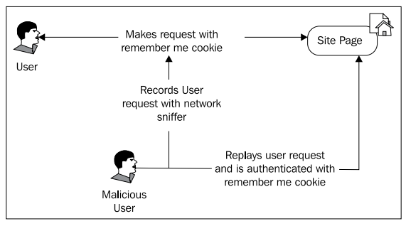 对我们精心保护的站点来说,为了用户体验而添加的任何与安全相关的功能,都有增加安全风险的潜在可能。按照其默认方式,Remember me功能存在用户的cookie被拦截并被恶意用户重用的风险。下图展现了这种情况是如何发生的: