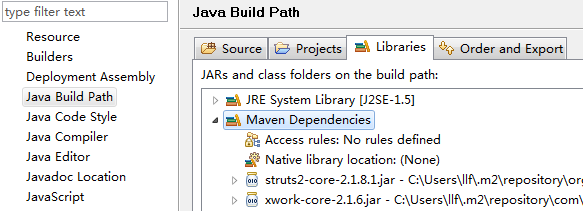 在工程属性的java build paths配置项中 order and export->将mavent dependencies项