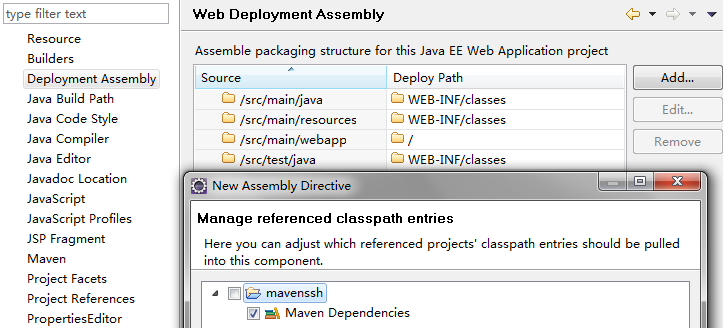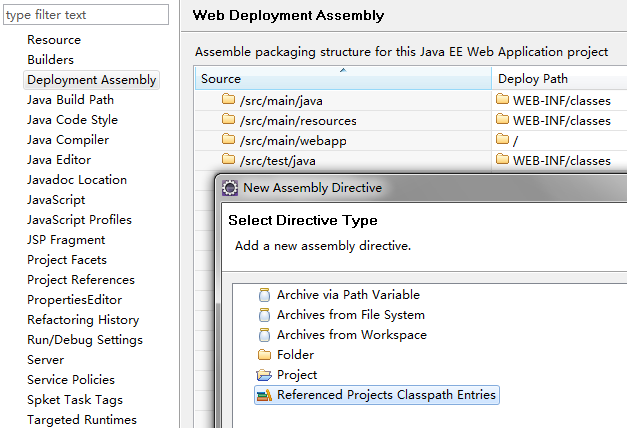 在工程属性中找到deployment assembly配置项--》add-->Referenced Projects classpath entries-->next