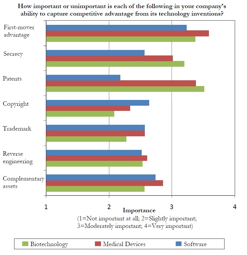 * 软件公司的执行人把专利考虑为竞争中最重要的因素。他们认为获得先发优势是最重要的因素,其次才是互补的资产收购,版权,商标,保密,以及软件的抗破解能力。