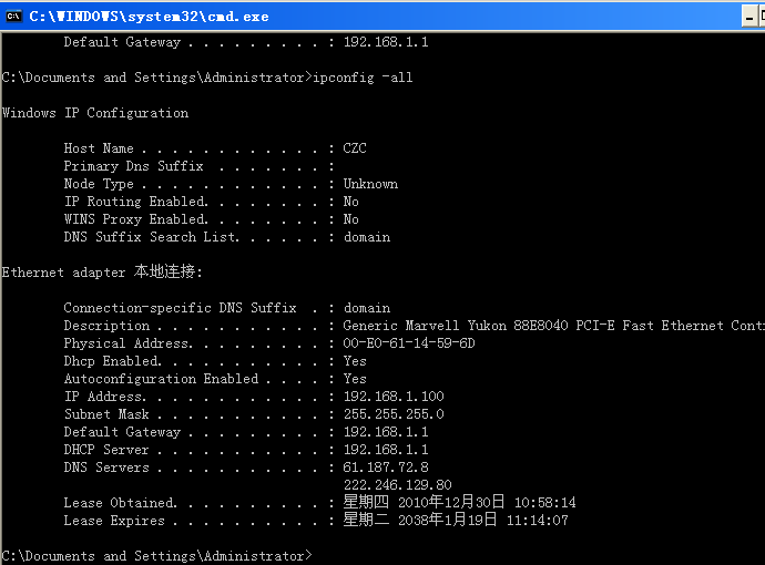 再在主机运行里面输入cmd,再在"黑框框"输入ipconfig -all,查看主机IP配置