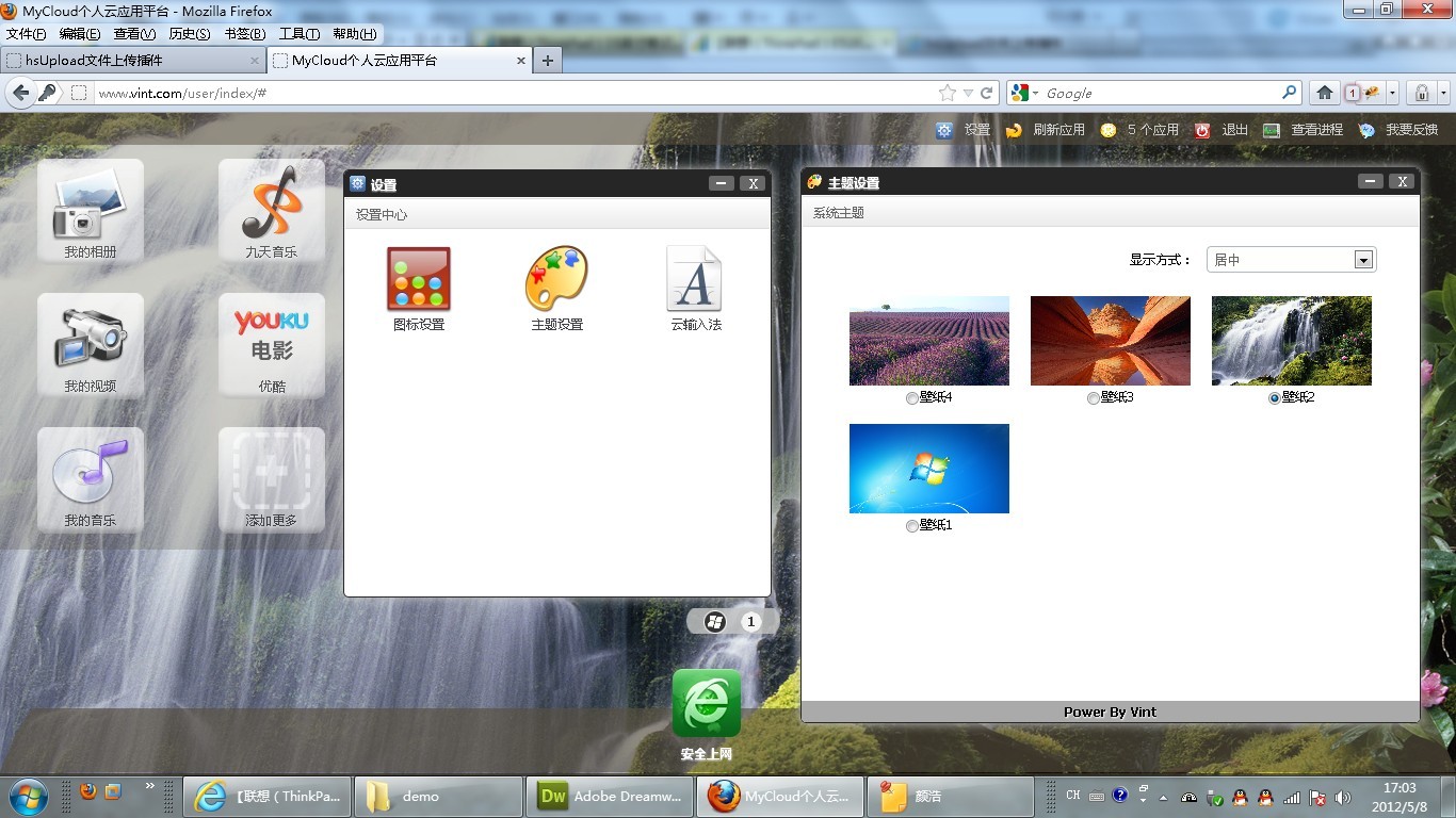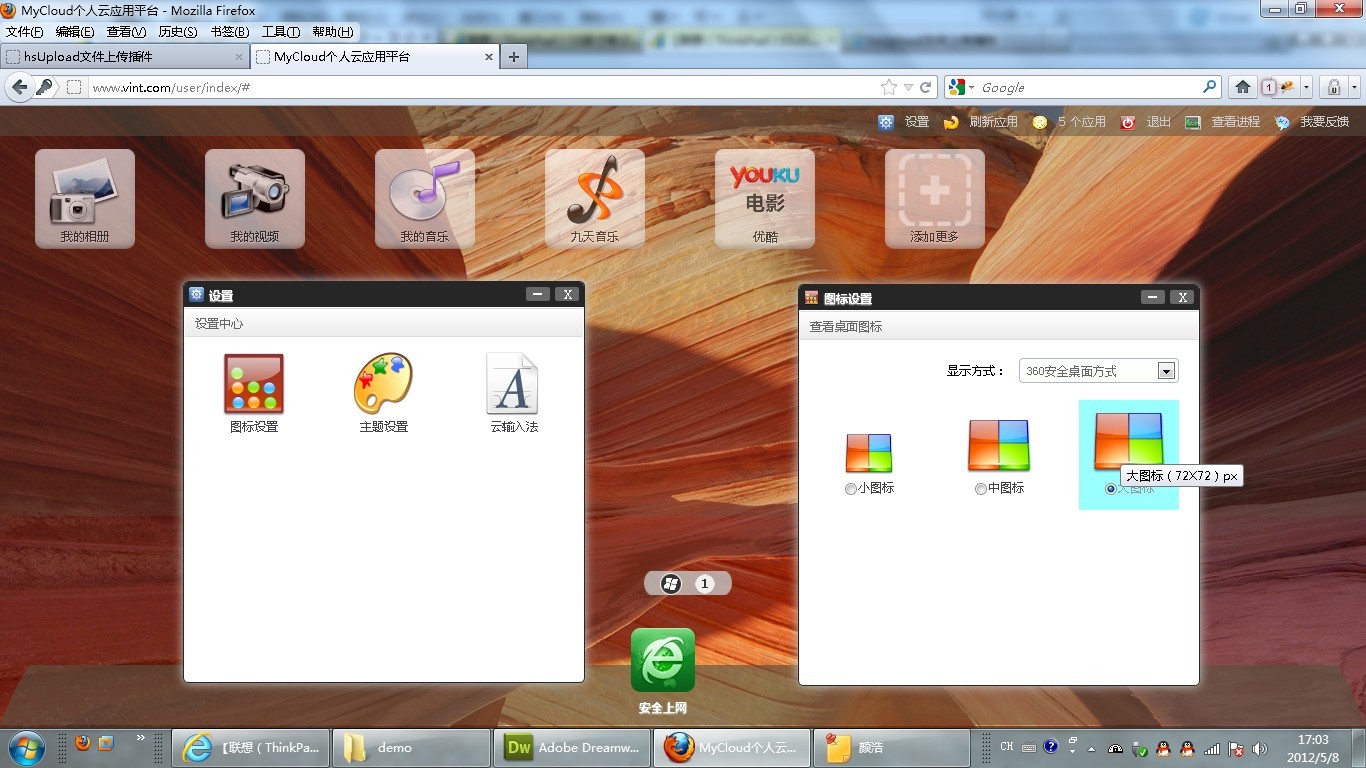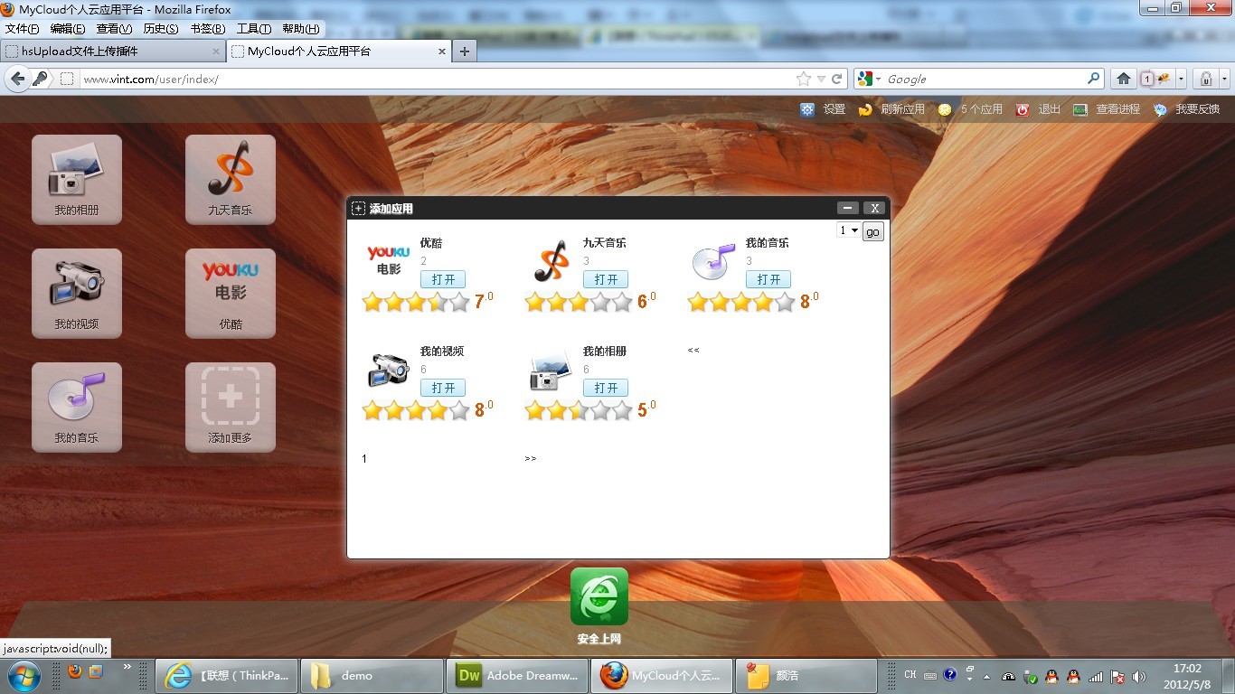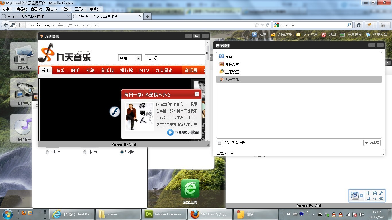 目前就实现这么多功能,因为我还要上班工作,这桌面系统什么都是自己一个人一个字母一个字母地敲出来,连弹窗和上传文件的都是自己写成jquery插件来用的。因个人能力和时间有限,所以只能在空闲时间抽时间来做,我会尽快把这东西做得更加完善让大家过下瘾,兴致来时可以在短时间内就能做很多东西。谢谢支持 1 楼 wxg313800336 2012-06-07 lz好厉害!