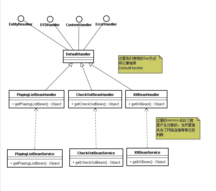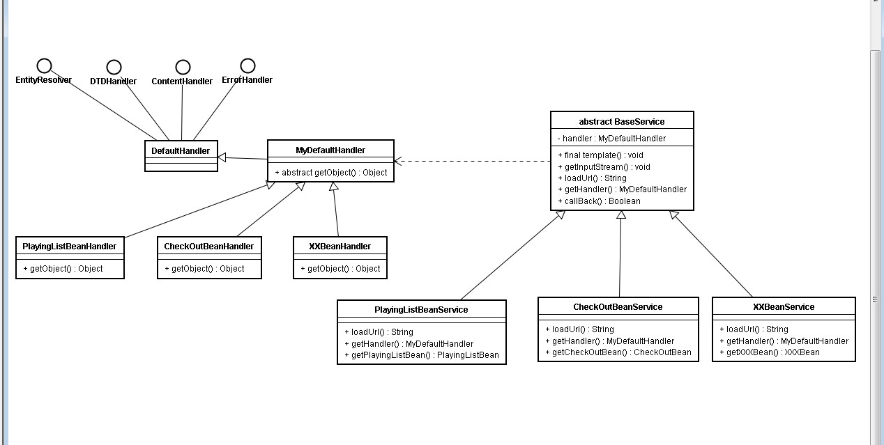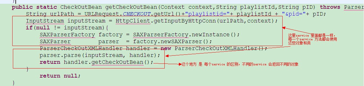 public static CheckOutBean getCheckOutBean(Context context,String playlistId,String pID) throws ParserConfigurationException, SAXException, IOException{String urlPath = URLRequest.CHECKOUT.getUrl()+"playlistid="+ playlistId + "&pid="+ pID; //这个地方每个sevice 的url 不同InputStream inputStream = HttpClient.getInputByHttpConn(urlPath,context);if(null != inputStream){SAXParserFactory factory = SAXParserFactory.newInstance();SAXParser parser = factory.newSAXParser();ParserCheckOutXMLHandler handler = new ParserCheckOutXMLHandler();//这个地方调用的 handler 不同parser.parse(inputStream, handler);return handler.getCheckOutBean(); //返回的对象不同}return null;}public static CheckUserPlayingBean getCheckUserPlayingBean(Context context,String playlistId) throws ParserConfigurationException, SAXException, IOException{String url = URLRequest.CHECKUSERPLAYING.getUrl()+ playlistId;InputStream inputStream = HttpClient.getInputByHttpConn(url,context);if(null != inputStream){SAXParserFactory factory = SAXParserFactory.newInstance();SAXParser saxParser = factory.newSAXParser();ParserCheckUserPlayingXMLHandler handler = new ParserCheckUserPlayingXMLHandler();saxParser.parse(inputStream, handler);return handler.getCheckUserPlayingBean();}return null;}public abstract class BaseService {int retryTimes = 5;protected Context context;protected String url;protected InputStream inputStream;protected SAXParserFactory factory;protected SAXParser parser;protected MyDefaultHandler handler;protected Object object;protected final void template(){getInputStream();if( null != inputStream ){factory = SAXParserFactory.newInstance();try {parser = factory.newSAXParser();handler = getHandler();parser.parse(inputStream, handler);} catch (ParserConfigurationException e) {e.printStackTrace();} catch (SAXException e) {e.printStackTrace();} catch (IOException e) {e.printStackTrace();}this.object = handler.getBean();}}private void getInputStream(){//这个方法 是因为某些 service 处理的逻辑需要反复的 去判断网络是否正常//所以我使用了一个callBack方法。。让子类决定是否调用这里面的逻辑if(callBack()){while(retryTimes>=1){inputStream = HttpClient.getInputByHttpConn(loadUrl(), context);if(null != inputStream){break;}try {Thread.sleep(100);} catch (InterruptedException e) {e.printStackTrace();}retryTimes --;}}inputStream = HttpClient.getInputByHttpConn(loadUrl(), context);}protected abstract String loadUrl();protected abstract MyDefaultHandler getHandler();protected boolean callBack(){return false;}}public abstract class MyDefaultHandler extends DefaultHandler {public abstract Object getBean();}