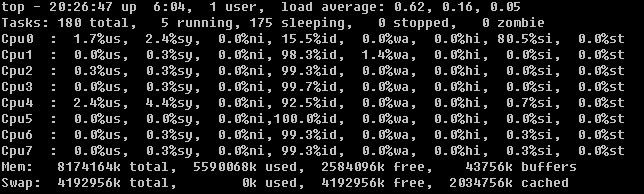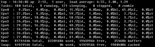 此时打开php页面已经有些困难,需要进行多次刷新才能打开。上图中cpu0负载偏低是因为测试时将网卡中断请求全部分配到cpu0上,并且在nginx中开启7个进程分别制定到cpu1-7。