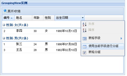 datas = [[1,,24,, Date(1986,06,09)], [2,,30,, Date(1980,09,13)], [3,,28,, Date(1982,01,10)]];                    person = Ext.data.Record.create([         {name: , mapping: 0},         {name: , mapping: 1},         {name: , mapping: 2},         {name: , mapping: 3},         {name: , mapping: 4}    ]);       grid = Ext.grid.GridPanel({         title: ,         renderTo: ,         width: 500,         height: 300,         frame: ,         tbar: [             {                 text: ,                 iconCls: ,                 handler: (){                     view = grid.getView();                                                           view.toggleAllGroups();                 }             }         ],                 store: Ext.data.GroupingStore({             reader: Ext.data.ArrayReader({id:0}, person),             data: datas,             sortInfo: {field:, direction:},             groupField:         }),         view: Ext.grid.GroupingView({             sortAscText: ,             sortDescText: ,             columnsText: ,             groupByText: ,             showGroupsText: ,             groupTextTpl:         }),                 columns: [             {id:, header:, width:50, dataIndex:},             {id:, header:, width:70, dataIndex:},             {id:, header:, width:45, dataIndex:},             {id:, header:, width:45, dataIndex:},             {id:, header:, width:120, dataIndex:, renderer:Ext.util.Format.dateRenderer()}         ]    });