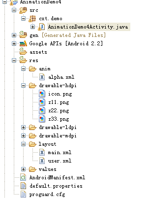 Animation使用方法(二)效果图同:Animation使用方法(一)的效果图工程结构图:[img][/img]可以看到,比Animati