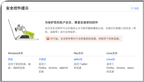9、于是,B找同事借了一台Windows系统的电脑,使用IE打开了支付宝,支付宝提示他要安装安全控件才可以使用。
