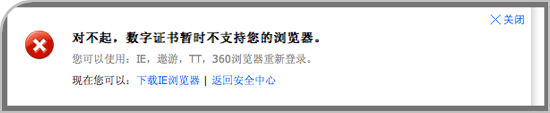 7、当他艰难地找到申请证书的入口时,系统提示说:对不起,数字证书暂时不支持您的浏览器。您可以使用:IE,遨游,TT,360浏览器重新登录。