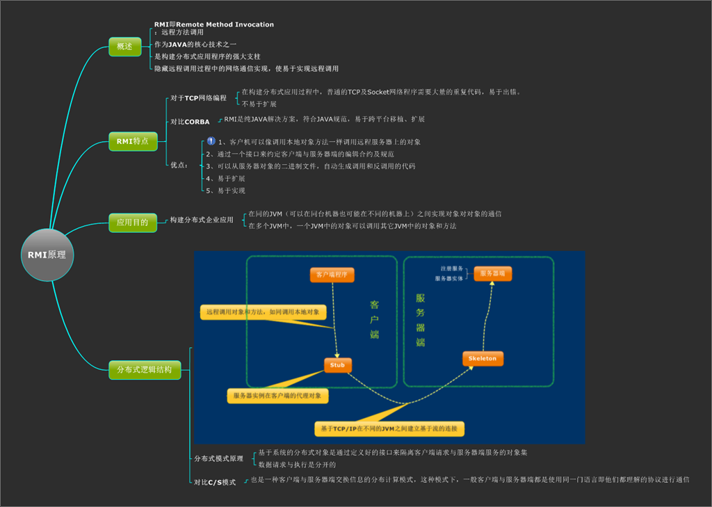 理解Android系统中的轻量级解决方案RPC的原理,需要先回顾一下JAVA中的RMI(Remote Method Invocation)这个易于使用的纯JAVA方案(用来实现分布式应用)。有关RMI的相关知识,可以通过下图来归纳: