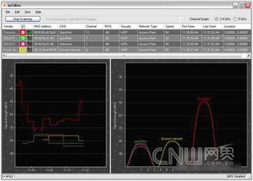 inSSIDer是一个WiFi检测器,如同Netstumbler一样。不过它最近又有了新版本,因而它还可以运行在Windows 7平台上。它可以检测并显示邻近的所有无线网络。更可喜的是,它拥有一个图形用户界面,显示了所检测到的网络,所使用的信道、硬件平台、信号强度等。你可以立即知道自己的接入点是否正与邻近的其它网络有冲突,或者可以知道是否有人安装了欺诈性接入点,从而造成了安全漏洞。或者,用户可以用此工具发现哪个无线网最适合自己的iPhone。