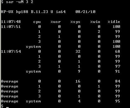 对于有4个CPU的系统,使用sar -u -M 3 2 (或 sar-uM 3 2), 有类似如下结果。