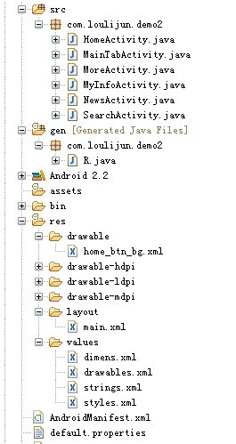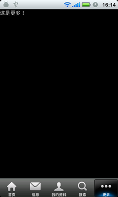 package com.loulijun.demo2;import android.app.TabActivity;import android.content.Intent;import android.os.Bundle;import android.view.Window;import android.widget.RadioGroup;import android.widget.TabHost;import android.widget.RadioGroup.OnCheckedChangeListener;public class MainTabActivity extends TabActivity implements OnCheckedChangeListener{private RadioGroup mainTab;private TabHost tabhost;private Intent iHome;private Intent iNews;private Intent iInfo;private Intent iSearch;private Intent iMore;    @Override    public void onCreate(Bundle savedInstanceState) {        super.onCreate(savedInstanceState);        requestWindowFeature(Window.FEATURE_NO_TITLE);        setContentView(R.layout.main);        mainTab=(RadioGroup)findViewById(R.id.main_tab);        mainTab.setOnCheckedChangeListener(this);        tabhost = getTabHost();                iHome = new Intent(this, HomeActivity.class);        tabhost.addTab(tabhost.newTabSpec("iHome")        .setIndicator(getResources().getString(R.string.main_home), getResources().getDrawable(R.drawable.icon_1_n))        .setContent(iHome));        iNews = new Intent(this, NewsActivity.class);tabhost.addTab(tabhost.newTabSpec("iNews")        .setIndicator(getResources().getString(R.string.main_news), getResources().getDrawable(R.drawable.icon_2_n))        .setContent(iNews));iInfo = new Intent(this, MyInfoActivity.class);tabhost.addTab(tabhost.newTabSpec("iInfo")        .setIndicator(getResources().getString(R.string.main_my_info), getResources().getDrawable(R.drawable.icon_3_n))        .setContent(iInfo));iSearch = new Intent(this,SearchActivity.class);tabhost.addTab(tabhost.newTabSpec("iSearch")        .setIndicator(getResources().getString(R.string.menu_search), getResources().getDrawable(R.drawable.icon_4_n))        .setContent(iSearch));iMore = new Intent(this, MoreActivity.class); tabhost.addTab(tabhost.newTabSpec("iMore")        .setIndicator(getResources().getString(R.string.more), getResources().getDrawable(R.drawable.icon_5_n))        .setContent(iMore));    }   @Overridepublic void onCheckedChanged(RadioGroup group, int checkedId) {switch(checkedId){case R.id.radio_button0:this.tabhost.setCurrentTabByTag("iHome");break;case R.id.radio_button1:this.tabhost.setCurrentTabByTag("iNews");break;case R.id.radio_button2:this.tabhost.setCurrentTabByTag("iInfo");break;case R.id.radio_button3:this.tabhost.setCurrentTabByTag("iSearch");break;case R.id.radio_button4:this.tabhost.setCurrentTabByTag("iMore");break;}}        }