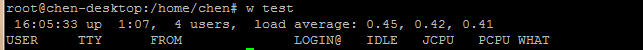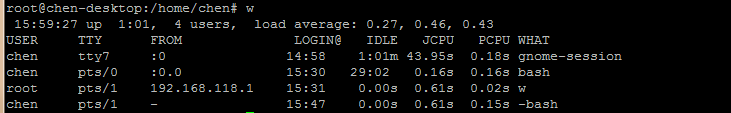 系统管理员若想知道某一时刻用户的行为,只需要输入命令W 即可,在SHELL终端中输入如下命令:
