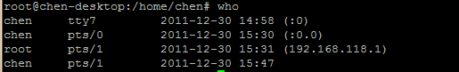 同样,系统管理员若想知道某一时刻登陆的用户,可以使用系统提供的who命令,该命令可以查看当前登陆到系统的用户及其他信息: