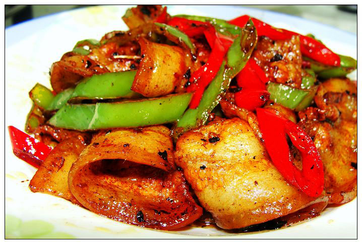 农家小炒肉 1、五花肉洗干净,混入盐2g、调和油1匙、生抽1匙、白胡椒1/5匙,静置15min。 2、青尖椒、红尖椒斜切。青椒混入半匙醋,静置5min后,洗净。 3、1匙调和油入锅,5成熟,加葱姜蒜末爆香,加五花肉肉稍炒至7成熟,起锅待用。 4、2匙调和油入锅,加青尖椒红尖椒,翻炒1min,再加已炒至7成熟的五花肉、姜丝,继续翻炒。其间,放老抽1匙、蚝油1匙。待肉全熟,放盐和味精起锅入盘。