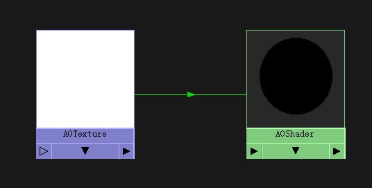 在材质编辑窗口,用鼠标中键把AOTexture 拖放到AOShader上面,再弹出的选择菜单中选Default方式,这就把AOTexture和AOShader以默认的方式连接起来。