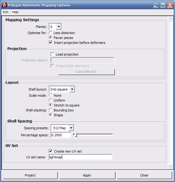 ? Finally, check Create New UV Set and name it “lightmap”.生成新的UV Set ,并命名为lightmap。