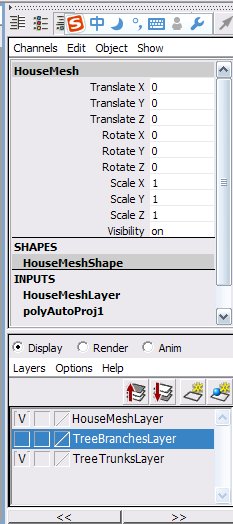在“Channel Box/Layer Editor”栏,隐藏“TreeBranchesLayer”树叶层;