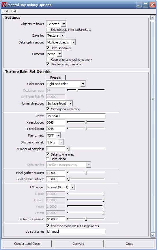 选择房子,选择菜单Color/Batch Bake(mental ray) (options)设置