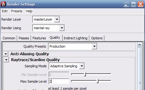 把“mental ray” 的渲染质量Quality Presets 提高为“Production”(生产级别的).