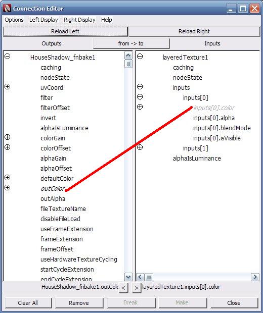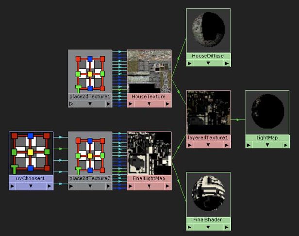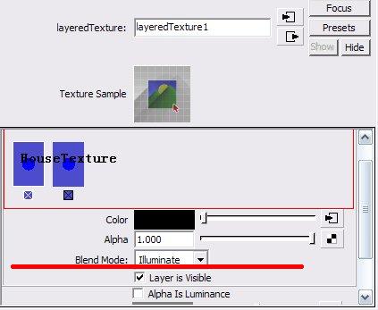 这里讲究的是一个思路和方法,我们生成了一个Layered Texture,然后把刚才生成的房子的材质和新烘焙、合成出来的黑白图,让他们以一种Illuminate(照明)的方式融合起来,然后赋予房子,需要说明的是unity能自动人maya的文件,同时,也认maya的分层贴图,最后的连接为