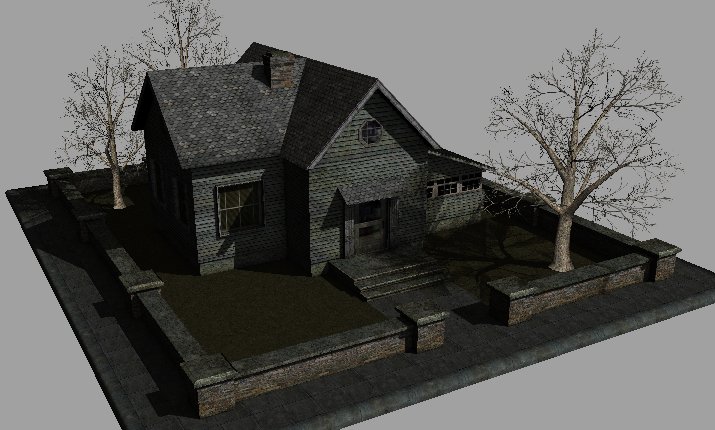 整个场景是包含了三个面物体(meshes): “HouseMesh”, “TreeTrunks”, 和 “TreeBranches”.