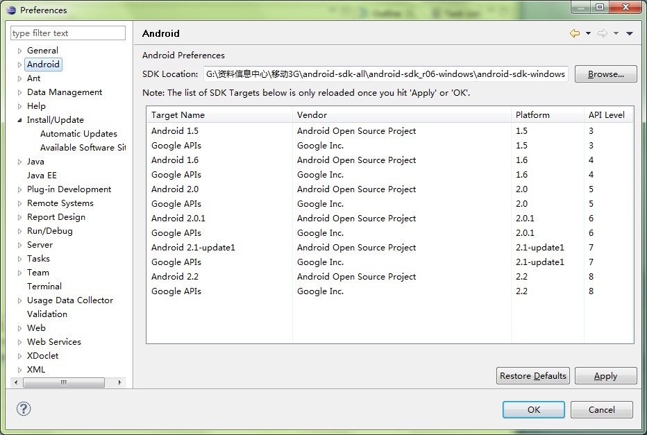 Eclipse重启后,选择Window > Preferences...,在打开的属性框,选择Android,在SDK location中输入你的Android SDK所在的目录,然后按 Apply按钮 即可看到你安装SDk包,如下图