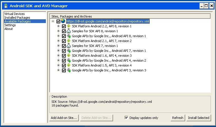 其实一般启动SDK Setup,都会自动检查更新包,弹出类似如下界面。根据你的要求自行选择所需安装包,安装即可。
