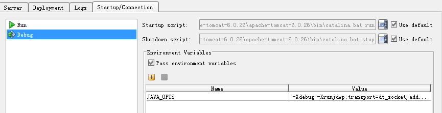idea debug下启动不能进入断点 debug下启动tomcat,代码不能进入断点:在Run--Edit configurations看见有JAVA_OPTS的设置,突然想起我在catalina.bat中设置过,导致idea中设置的被覆盖,注释掉catalina.bat中的设置,debug下重启tomcat,就可以进入断点了。参考:http://wwwwfw.blog.163.com/blog/static/31727815201022623712861/