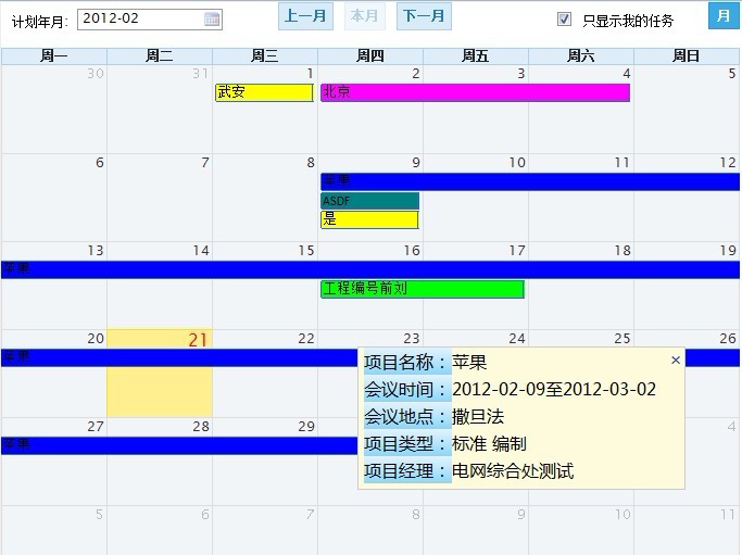 <script type='text/javascript'><!--var allProjects = new Array();var hostname = location.hostname;/*dayclick绑定的函数*/function showCurrentDayProjects(datetime){$("#projectlist").empty()var j = 0$("#selectDayClick").empty().append(datetime.pattern("yyyy-MM-dd"));for(var i=0 ;i<allProjects.delRepeat().length;i++){if (allProjects[i].startDateLong <= datetime.getTime() && allProjects[i].endDateLong >= datetime.getTime()){$("#projectlist").append("<li><span class='first'>"+(++j)+")</span><span class='second'>"+allProjects[i].projectName+"</span><span class='third'><a href=xxxurl?id="+allProjects[i].id+"'>详情</a></span></li>")}}}Array.prototype.delRepeat=function(){var newArray=new Array();var len=this.length;for (var i=0;i<len ;i++){for(var j=i+1;j<len;j++){if(this[i].id===this[j].id){j=++i;}}newArray.push(this[i]);}return newArray;}$(document).ready(function() {var date = new Date();var d = date.getDate();var m = date.getMonth();var y = date.getFullYear();var d = new Date();$("#selecteddate").attr("value",date.pattern("yyyy-MM"));var calendar = $('#calendar').fullCalendar({theme: false,editable:false, header: { left: '', center: 'prev, today next ', right: 'month' //right: 'month,agendaWeek,agendaDay' }, monthNames: ["一月", "二月", "三月", "四月", "五月", "六月", "七月", "八月", "九月", "十月", "十一月", "十二月"], monthNamesShort: ["一月", "二月", "三月", "四月", "五月", "六月", "七月", "八月", "九月", "十月", "十一月", "十二月"], dayNames: ["周日", "周一", "周二", "周三", "周四", "周五", "周六"], dayNamesShort: ["周日", "周一", "周二", "周三", "周四", "周五", "周六"], today: ["今天"], firstDay: 1, buttonText: { today: '本月', month: '月', week: '周', day: '日', prev: '上一月', next: '下一月' },editable: false,currentTimezone: 'Asia/Beijing',eventClick: function(event) {if($("#eventInfo").css("display")=="none"){alert(event.projectName)var x = window.event.x;var y = window.event.y;//alert(x + "<>" + y );$("#eventInfo").css("display", "block");$("#eventInfo").css("top",200);$("#eventInfo").css("left",300);$("#name").html(event.name);$("#time").html(event.time);$("#location").html(event.location);$("#participants").html(event.participants);$("#manager").html(event.manager);}else{$("#eventInfo").css("display", "none");}return false;},eventMouseover:function(event){$("#eventInfo").css("display", "block");$("#eventInfo").css("top",200);$("#eventInfo").css("left",300);$("#name").html(event.projectName);$("#time").html(event.start.pattern("yyyy-MM-dd") +"至"+event.end.pattern("yyyy-MM-dd"));$("#location").html(event.location);$("#participants").html(event.participants);$("#manager").html(event.manager);$("#eventInfo").show();},eventMouseout:function(event){$("#eventInfo").hide();}, dayClick: function(date, allDay, jsEvent, view ){ showCurrentDayProjects(date); }, selectable: false, selectHelper: false, select: function(start, end, allDay) { var title = prompt('请输入名称:'); if (title) { calendar.fullCalendar('renderEvent', { title: title, start: start, end: end, allDay: allDay }, true // make the event "stick" );//把刚输入的日程计划在页面上进行显示 //alert($.fullCalendar.formatDate(start,'yyyy-MM-dd HH:mm:ss')); $.post("schedule/add",{//把刚输入的日程计划信息传到后台,保存到数据库 title: title, start:($.fullCalendar.formatDate(start,'yyyy-MM-dd h:mm:ss')) , end:($.fullCalendar.formatDate(end,'yyyy-MM-dd h:mm:ss')), allDay:allDay} ); } calendar.fullCalendar('unselect'); }, editable: false, //events:'/tiantian/schedule/containEvents' events:[]//表示初始化时的数据,这里是空的,等前面的ajax请求返回后就会有新的数据在页面显示 });// 重新注册 左上角三个按钮 : 功能按钮jQuery('.fc-button-prev').unbind('click');jQuery('.fc-button-next').unbind('click');jQuery('.fc-button-prev').bind('click', fnMthChange);jQuery('.fc-button-next').bind('click', fnMthChange);jQuery('.fc-button-today').bind('click', fnMthChange);function fnMthChange() {changeTime(this.innerText);if (jQuery('#calendar').fullCalendar('getView').name == "month") {showTime();}}function perMonth(){var date = $("#selecteddate").attr("value",date);var year = date.split("-")[0];var month = date.split("-")[1];if(month >1 ){month = month -1$("#selecteddate").attr("value",year +"-" +month)}else{year = year - 1 month = 12;$("#selecteddate").attr("value",year +"-" +month)}}function nextMonth(){var date = $("#selecteddate").attr("value",date)var year = date.split("-")[0];var month = date.split("-")[1];if(month <12 ){month = Number(month) + 1$("#selecteddate").attr("value",year +"-" +month)}else{year = Number(year) + 1 month = 1;$("#selecteddate").attr("value",year +"-" +month)}}function thisMyMonth(){var d = new Date();// alert("今天星期"+"天一二三四五六".charAt(new Date(d).getDay()));$("#selecteddate").attr("value",d.pattern("yyyy-MM")); }function changeTime(label) {if (jQuery.trim(label) == "上一月") {jQuery('#calendar').fullCalendar('prev');perMonth();} else if (jQuery.trim(label) == "下一月") {jQuery('#calendar').fullCalendar('next');nextMonth();} else if (jQuery.trim(label) == "本月") {jQuery('#calendar').fullCalendar('today');thisMyMonth();}}showTime();});function showTime() {var view = jQuery('#calendar').fullCalendar('getView');var start = toStrDateTime(view.start); // view.calendar.formatDate(view.start,// 'u2');var end = toStrDateTime(view.end);// view.calendar.formatDate(view.end,// 'u2');// 查询 var viewStart = $.fullCalendar.formatDate(view.start,"yyyy-MM-dd"); var viewviewName = view.name; var onlyshowMe = $("#onlyMeTask").attr("checked"); //alert(viewStart+viewName); //alert(viewStart); var datetime = new Date().getTime(); $("#calendar").fullCalendar('removeEvents'); for(var i= allProjects.length -1 ;i>0 ;i--){ allProjects.pop(); } $.getJSON('xxxurl',{onlyMeTask:onlyshowMe,underYear:'2011',underMonth:'12',start:viewStart,datetime: