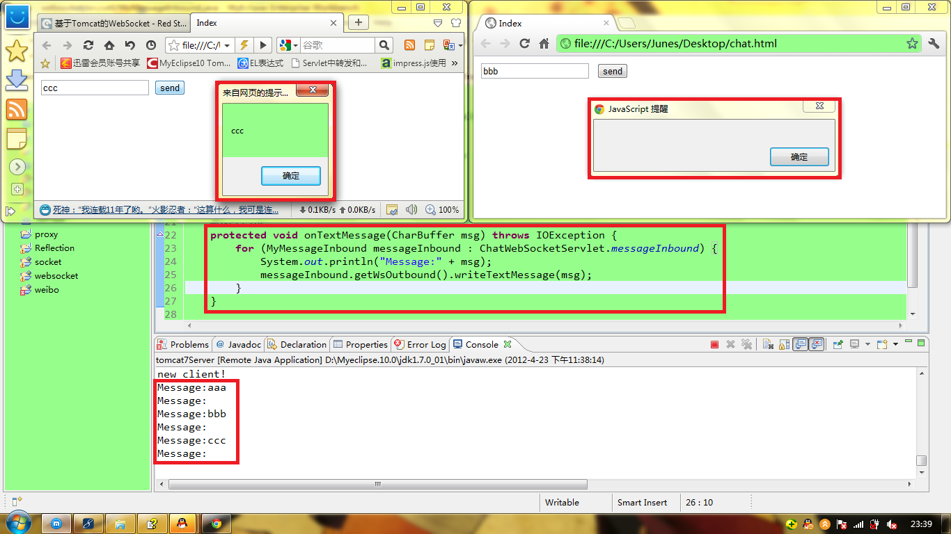对了,请问怎么样实现把消息发给多个用户?我在onTextMessage方法里调用MessageInbound集合里子对象的getWsOutbound().writeTextMessage(msg)方法,但那个msg对象是Charbuffer类型,好像不能通过循环来发送给每个客户端(只能发给第一个客户端),然后msg就什么也没有了..![]()
