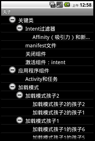 package com.iaiai;import java.util.ArrayList;/** * * <p> * Title: TreeElement.java * </p> * <p> * E-Mail: 176291935@qq.com * </p> * <p> * QQ: 176291935 * </p> * <p> * Http: iaiai.iteye.com * </p> * <p> * Create time: 2011-8-20 * </p> * * @author 丸子 * @version 0.0.1 */public class TreeElement {private String id;private String outlineTitle;private boolean mhasParent;private boolean mhasChild;private TreeElement parent;private int level;private ArrayList<TreeElement> childList = new ArrayList<TreeElement>();public String getId() {return id;}public void setId(String id) {this.id = id;}public String getOutlineTitle() {return outlineTitle;}public void setOutlineTitle(String outlineTitle) {this.outlineTitle = outlineTitle;}public boolean isMhasParent() {return mhasParent;}public void setMhasParent(boolean mhasParent) {this.mhasParent = mhasParent;}public boolean isMhasChild() {return mhasChild;}public void setMhasChild(boolean mhasChild) {this.mhasChild = mhasChild;}public int getLevel() {return level;}public void setLevel(int level) {this.level = level;}public boolean isExpanded() {return expanded;}public void setExpanded(boolean expanded) {this.expanded = expanded;}public ArrayList<TreeElement> getChildList() {return childList;}public TreeElement getParent() {return parent;}public void setParent(TreeElement parent) {this.parent = parent;}// private OutlineElement outlineElement;private boolean expanded;public void addChild(TreeElement c) {this.childList.add(c);this.mhasParent = false;this.mhasChild = true;c.parent = this;c.level = this.level + 1;}public TreeElement(String id, String title) {super();this.id = id;this.outlineTitle = title;this.level = 0;this.mhasParent = true;this.mhasChild = false;this.parent = null;}public TreeElement(String id, String outlineTitle, boolean mhasParent,boolean mhasChild, TreeElement parent, int level, boolean expanded) {super();this.id = id;this.outlineTitle = outlineTitle;this.mhasParent = mhasParent;this.mhasChild = mhasChild;this.parent = parent;if (parent != null) {this.parent.getChildList().add(this);}this.level = level;this.expanded = expanded;}}package com.iaiai;import java.util.ArrayList;import java.util.List;import android.app.ListActivity;import android.content.Context;import android.graphics.Bitmap;import android.graphics.BitmapFactory;import android.os.Bundle;import android.util.Log;import android.view.LayoutInflater;import android.view.View;import android.view.ViewGroup;import android.widget.ArrayAdapter;import android.widget.ImageView;import android.widget.ListView;import android.widget.TextView;import android.widget.Toast;/** * * <p> * Title: TreeView.java * </p> * <p> * E-Mail: 176291935@qq.com * </p> * <p> * QQ: 176291935 * </p> * <p> * Http: iaiai.iteye.com * </p> * <p> * Create time: 2011-8-20 * </p> * * @author 丸子 * @version 0.0.1 */public class TreeView extends ListActivity {private ArrayList<TreeElement> mPdfOutlinesCount = new ArrayList<TreeElement>();private TreeViewAdapter treeViewAdapter = null;/** Called when the activity is first created. */@Overridepublic void onCreate(Bundle savedInstanceState) {super.onCreate(savedInstanceState);initialData();treeViewAdapter = new TreeViewAdapter(this, R.layout.main,mPdfOutlinesCount);setListAdapter(treeViewAdapter);registerForContextMenu(getListView());}private void initialData() {TreeElement element1 = new TreeElement("01", "关键类");TreeElement element2 = new TreeElement("02", "应用程序组件");TreeElement element3 = new TreeElement("03", "Activity和任务");TreeElement element4 = new TreeElement("04", "激活组件:intent");TreeElement element5 = new TreeElement("05", "关闭组件");TreeElement element6 = new TreeElement("06", "manifest文件");TreeElement element7 = new TreeElement("07", "Intent过滤器");TreeElement element8 = new TreeElement("08", "Affinity(吸引力)和新任务");TreeElement element9 = new TreeElement("09", "加载模式");TreeElement element10 = new TreeElement("10", "加载模式孩子1");TreeElement element11 = new TreeElement("11", "加载模式孩子2");TreeElement element12 = new TreeElement("12", "加载模式孩子2的孩子1");TreeElement element13 = new TreeElement("13", "加载模式孩子2的孩子2");TreeElement element14 = new TreeElement("14", "加载模式孩子1的孩子1");TreeElement element15 = new TreeElement("15", "加载模式孩子1的孩子2");TreeElement element16 = new TreeElement("16", "加载模式孩子1的孩子3");TreeElement element17 = new TreeElement("17", "加载模式孩子1的孩子4");TreeElement element18 = new TreeElement("18", "加载模式孩子1的孩子5");TreeElement element19 = new TreeElement("19", "加载模式孩子1的孩子6");mPdfOutlinesCount.add(element1);mPdfOutlinesCount.add(element2);mPdfOutlinesCount.add(element9);element2.addChild(element3);element1.addChild(element4);element1.addChild(element5);element1.addChild(element6);element1.addChild(element7);element7.addChild(element8);element9.addChild(element10);element9.addChild(element11);element11.addChild(element12);element11.addChild(element13);element10.addChild(element14);element10.addChild(element15);element10.addChild(element16);element10.addChild(element17);element10.addChild(element18);element10.addChild(element19);}@SuppressWarnings("unchecked")private class TreeViewAdapter extends ArrayAdapter {public TreeViewAdapter(Context context, int textViewResourceId,List objects) {super(context, textViewResourceId, objects);mInflater = LayoutInflater.from(context);mfilelist = objects;mIconCollapse = BitmapFactory.decodeResource(context.getResources(), R.drawable.outline_list_collapse);mIconExpand = BitmapFactory.decodeResource(context.getResources(),R.drawable.outline_list_expand);}private LayoutInflater mInflater;private List<TreeElement> mfilelist;private Bitmap mIconCollapse;private Bitmap mIconExpand;public int getCount() {return mfilelist.size();}public Object getItem(int position) {return position;}public long getItemId(int position) {return