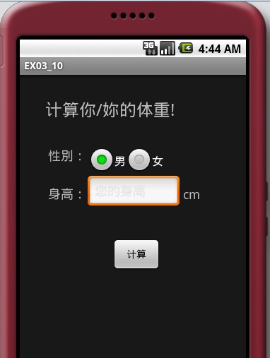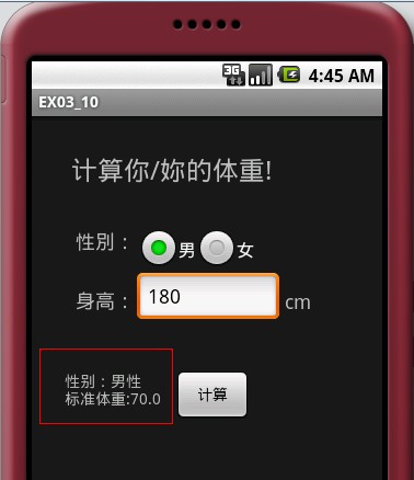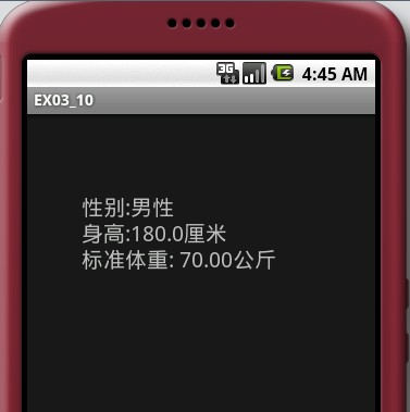 import android.os.Parcel;import android.os.Parcelable;public class WeightParcelable implements Parcelable {private String sex;private double height;//必须的空构造器,因为下面有一个私有的构造器,否则不能new对象public WeightParcelable() {}public String getSex() {return sex;}public void setSex(String sex) {this.sex = sex;}public double getHeight() {return height;}public void setHeight(double height) {this.height = height;}@Overridepublic int describeContents() {return 0;}//需要覆盖的方法@Overridepublic void writeToParcel(Parcel out, int flags) {out.writeString(sex);out.writeDouble(height);}//关键的事情public static final Parcelable.Creator<WeightParcelable> CREATOR = new Parcelable.Creator<WeightParcelable>() {public WeightParcelable createFromParcel(Parcel in) {return new WeightParcelable(in);}public WeightParcelable[] newArray(int size) {return new WeightParcelable[size];}};//private WeightParcelable(Parcel in) {sex = in.readString();height = in.readDouble();}}import java.io.Serializable;public class HeightSerializable implements Serializable {private static final long serialVersionUID = 8502706820090766507L;private String sex;private double weight;public String getSex() {return sex;}public void setSex(String sex) {this.sex = sex;}public double getWeight() {return weight;}public void setWeight(double weight) {this.weight = weight;}}import android.app.Activity;import android.content.Intent;import android.os.Bundle;import android.util.Log;import android.view.View;import android.widget.Button;import android.widget.EditText;import android.widget.RadioButton;import android.widget.TextView;public class EX03_10 extends Activity {/** Called when the activity is first created. */public static final String parcelableKey = "irdc.ex03_10.parcelableKey";public static final String seralizableKey = "irdc.ex03_10.seralizableKey";private static final String TAG = "EX03_10";@Overridepublic void onCreate(Bundle savedInstanceState) {super.onCreate(savedInstanceState);setContentView(R.layout.main);Button b1 = (Button) findViewById(R.id.button1);b1.setOnClickListener(new Button.OnClickListener() {public void onClick(View v) {EditText et = (EditText) findViewById(R.id.height);double height = Double.parseDouble(et.getText().toString());String sex = "";RadioButton rb1 = (RadioButton) findViewById(R.id.sex1);if (rb1.isChecked()) {sex = "M";} else {sex = "F";}Intent intent = new Intent();intent.setClass(EX03_10.this, EX03_10_1.class);Bundle bundle = new Bundle();WeightParcelable wp = new WeightParcelable();wp.setSex(sex);wp.setHeight((int) height);bundle.putParcelable(parcelableKey, wp);intent.putExtras(bundle);//注意这里startActivityForResult(intent, 1);}});}//这个是关键@Overrideprotected void onActivityResult(int requestCode, int resultCode, Intent data) {Log.d(TAG, "onActivityResult requestCode=" + requestCode+ " resultCode= " + resultCode + " data == null["+ (data == null) + "]");super.onActivityResult(requestCode, resultCode, data);if (requestCode == 1) {if (resultCode == RESULT_OK) {try {HeightSerializable hs = (HeightSerializable) data.getSerializableExtra(seralizableKey);TextView textView4 = (TextView) findViewById(R.id.text4);textView4.setText("性别:" + hs.getSex() + "\n标准体重:"+ hs.getWeight());} catch (Exception e) {e.printStackTrace();}}}}}import java.text.DecimalFormat;import java.text.NumberFormat;import android.app.Activity;import android.content.Intent;import android.os.Bundle;import android.util.Log;import android.widget.TextView;public class EX03_10_1 extends Activity {private static final String TAG = "EX03_10_1";@Overridepublic void onCreate(Bundle savedInstanceState) {super.onCreate(savedInstanceState);setContentView(R.layout.myalyout);WeightParcelable wp = (WeightParcelable) getIntent().getParcelableExtra(EX03_10.parcelableKey);String sex = wp.getSex();double height = wp.getHeight();String sexText = "";if (sex.equals("M")) {sexText = "男性";} else {sexText = "女性";}String weight = this.getWeight(sex, height);TextView tv1 = (TextView) findViewById(R.id.text1);tv1.setText("性别:" + sexText + "\n身高:" + height + "厘米\n标准体重: " + weight+ "公斤");// 返回对象Intent data = new Intent();HeightSerializable hs = new HeightSerializable();hs.setSex(sexText);hs.setWeight(Double.valueOf(weight));data.putExtra(EX03_10.seralizableKey, hs);//从这里返回对象setResult(RESULT_OK, data);}private String format(double num) {NumberFormat formatter = new DecimalFormat("0.00");String s = formatter.format(num);return s;}private String getWeight(String sex, double height) {String weight = "";if (sex.equals("M")) {weight = format((height - 80) * 0.7);} else {weight = format((height - 70) * 0.6);}return weight;}} 1 楼 windloverain 2010-12-01 不错,学习了,一会试试。 2 楼 whao189 2011-05-19 我有个问题。。想 请教一下。。