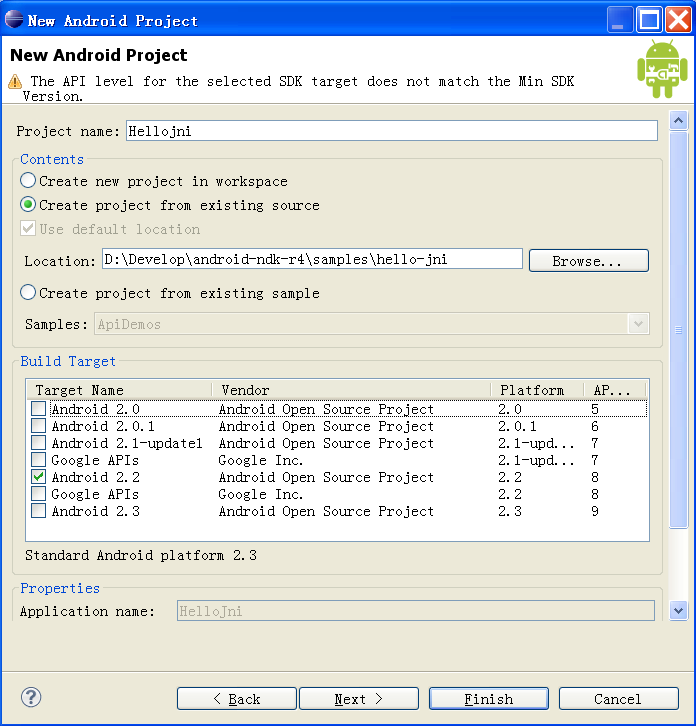 3. Select any API level above Android 1.5.I use Android API 2.2.