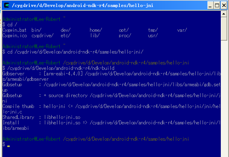 B.用ndk-build命令编译原生码。打开cygwin客户端:
